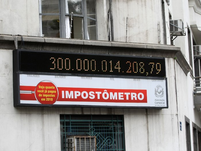 Segunfo o IMPOSTÔMETRO afixado no centro da cidade de São Paulo, na Associação Comercial de São Paulo, alcançou a marca de R$300.000.014.208,79 hoje às12:43. O novo recrde de arrecadação de impostos no Brasil. Esse Impostômetro faz a contagem dos impostos arrecadados nas três esferas de governo: municipal, estadual e federal.